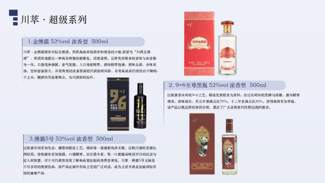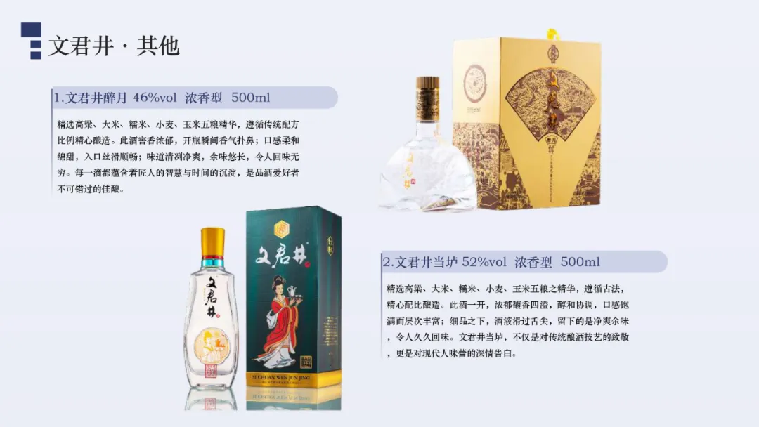 具有上百年酿酒历史的四川文君井酒业集团,是一家集科研、生产、销售、技术、服务为一体的大型白酒生产企业,为中国最大白酒原酒基地酿酒头部企业之一,现有窖池3000余口,年产优质原酒上万吨,常年储存浓香型原酒20000余吨,为首届四川省原酒生产企业20强。经过几十年的成长,集团已进入中国白酒行业前沿,成为行业领先的综合性大型白酒企业。