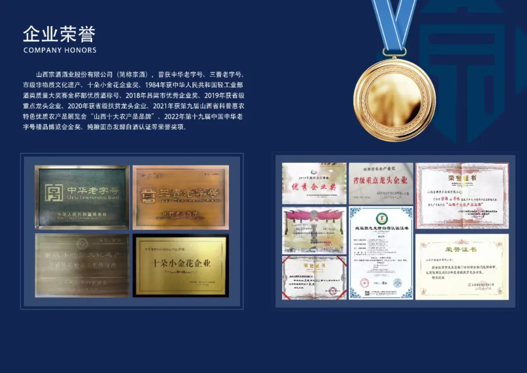 山西宗酒酒业股份有限公司(简称宗酒),曾获中华老字号三晋老字号、市级非物质文化遗产、十朵小金花企业奖、1984年获中华人民共和国轻工业部酒类质量大奖赛金杯部优质酒称号、2018年吕梁市优秀企业奖、2019年获省级重点龙头企业、2020年获省级扶贫龙头企业、2021年获第九届山西省科普惠农特色优质农产品展览会“山西十大农产品品牌”、2022年第十九届中国中华老字号精品博览会金奖、纯粮固态发酵白酒认证等荣誉奖项。