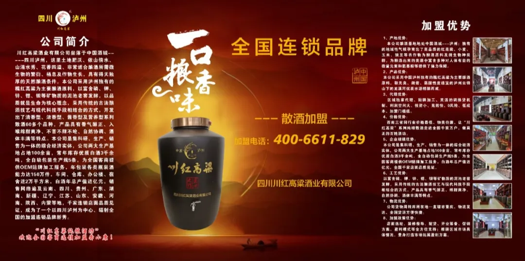 川红高梁酒业有限公司坐落于中国酒城——四川泸州,这里土地肥沃、依山傍水、山清水秀、花香四溢、非常适合酿酒所需微生物的繁衍、栖息及作物生长,具有得天独厚的天然酿酒条件。本公司采用泸州独有的糯红高梁为主要酿酒原料,以富含磷、钾、锌、锶、钡等矿物质的泥池老窖发酵,以品质就是生命为核心理念,采用传统的古法酿酒技艺与现代科技手段相结合的方式,开发出了清香型、浓香型、酱香型及营养型系列散酒60多个品种,产品县有香气醇正、入喉绵甜爽净、不苦不辣不呛、自然协调、酒家体丰满等特点。本公司是集科研、生产、销售为一体的综合经济实体,公司两大生产基地占地100余亩,常年库存优质白酒3千余吨,全自动包装生产线5条,为全国客商提供OEM贴牌加工服务,年包装各类瓶装酒能力达150万件,车间、仓库、办公楼、宿舍近2万平方米,白酒年总产值近亿元,销售网络遍及云南、四川、贵州、广东、湖南、新疆、辽宁、江苏、山东、安徽、河南·陕西、内蒙等地,千家连锁店面品质见证,成为了一个以四川泸州为中心、辐射全国的加盟连锁品牌新秀。